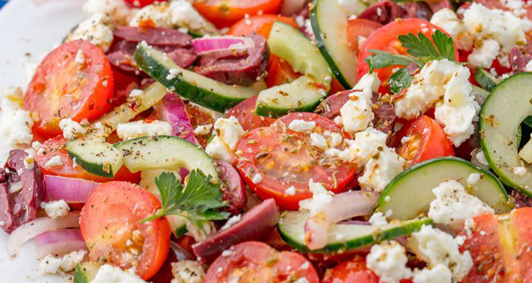 Add lettuce, tomato, cucumber, onion, bell pepper, and garbanzo beans to a bowl.
