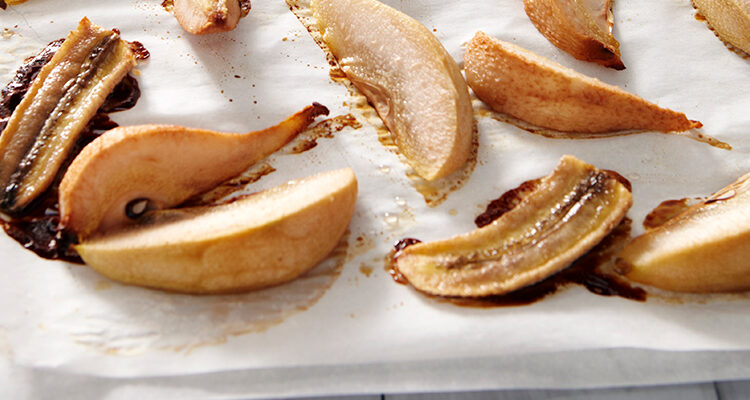 Place the banana and pear wedges on parchment paper or lined baking sheet.