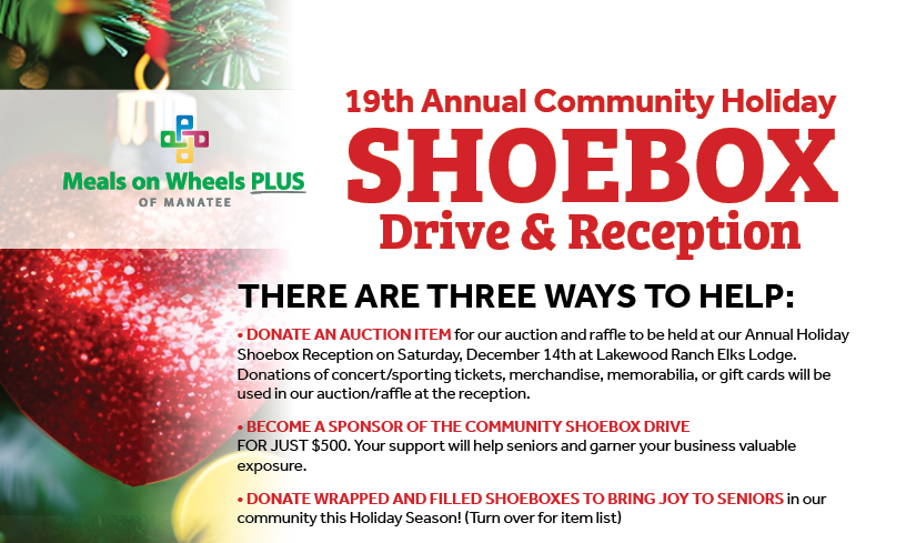 We hope to collect 1,000 shoeboxes for volunteers and staff of Meals on Wheels PLUS to deliver to seniors throughout the holidays. These boxes are often times the only Holiday present seniors receive. This year it is especially important because of the isolation so many of our seniors are facing. Please help us put some joy in the holidays for Manatee County seniors.